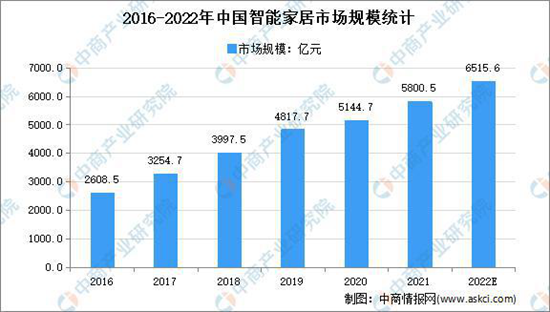 在2019年底中国已成为全球最大的物联网市场,全球15亿台蜂窝网络连接设备中9.6亿台来自中国,占比64%。中国将成为全球最大的智能家居市场消费国,占据全球50%-60%的智能家居市场消费份额,利润占据全球20%-30%的市场份额。数据显示,2016-2020年我国智能家居市场规模由2608.5亿元增至5144.7亿元,年均复合增长率为18.51%。中商产业研究院预测,2022年我国智能家居市场规模可达6515.6亿元。