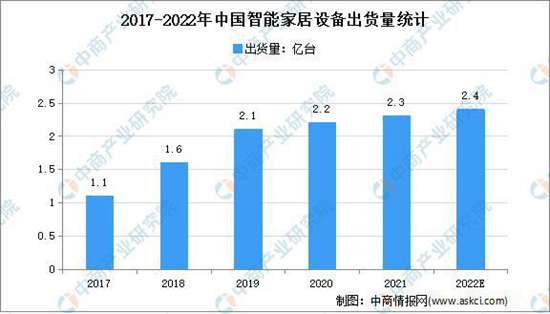 近年来,我国智能家居出货量快速增长。数据显示,2017年中国智能家居设备市场规模仅1.14亿台,2019年中国智能家居市场出货量突破2亿大关,达到2.08亿台,较2018年增长33.5%。受疫情影响,2020年中国智能家居设备市场出货量为2.2万台。预测2022年中国智能家居设备出货量将达2.4亿台,2025年将接近5.4亿台。