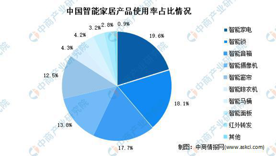 家庭自动化主要是以一个中央微处理机接收来自相关电子电器产品,主要产品有智能照明、智能家电、智能安保等。数据显示,在我国智能家居产品使用率统计情况中,智能家电使用频率最高达19.6%。其次为智能锁和智能音箱,分别占比18.1%和17.7%。