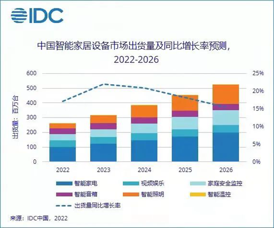 IDC认为,在不断的优化中,市场将迎来新的发展机会,预计2022年中国智能家居设备市场出货量将突破2.6亿台,同比增长17.1%,尤其是伴随全屋智能家居解决方案的普及,这一行业仍有很大发展潜力。