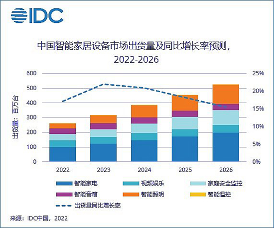 智能家居已成为最具潜力的消费科技市场,主要在于消费者对各种智能设备保持着强劲的需求,市场前景广阔。从出货量数据来看,2021年我国智能家居设备市场出货量超过2.2亿台,2022年预计出货量将突破2.6亿台,同比增长17.1%;到2026年预计突破5亿台。这一数据来自IDC最新的中国智能家居设备市场季度跟踪报告。同时,IDC指出虽然中国智能家居市场已经历经了几年的发展,但仍远未实现普及。