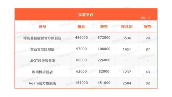 德施曼、萤石、绿米在各个平台的运营都非常优秀,在淘宝平台德施曼的粉丝量100万+,萤石的粉丝量80万+,Aqara粉丝量60万+,欧瑞博10万+;抖音平台德施曼粉丝48万+;Aqara粉丝量10万+;萤石粉丝量9.7万;超级智慧家8.6万;京东平台萤石粉丝量192万+;德施曼粉丝量95万+;Aqara粉丝量55万。各个企业有各自优势平台,同时都在努力打造不同平台的直播间。