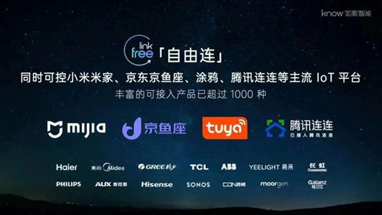 如影开发的Free Link「自由连」技术,集成了市面常见的七种主流的通讯协议,包含ZigBee、WiFi、KNX、RS485、以太网、蓝牙、RJ45,有线+无线最大程度确保了对于第三方生态单品的兼容性,并且支持语音、屏幕、超级旋钮、app、快捷按键五种多模态交互方式来满足更多用户的控制需求。目前,米家生态的设备可以一键导入到如影智能中来,而同时京东京鱼座、涂鸦、腾讯连连等物联网平台的生态也已经打通,可接入的家中常用生态单品已经超过了1000种。