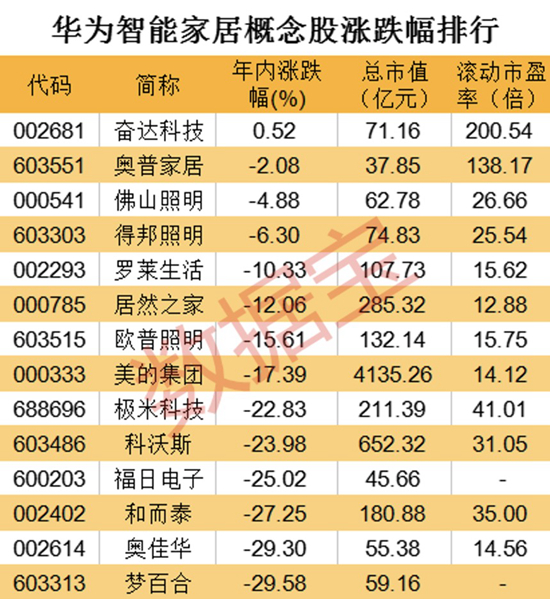 证券时报·数据宝统计,智能家居概念股中,和而泰主营家用电器智能控制器,今年3月14日机构调研中,在回应投资者提出的华为的全屋智能解决方案合作情况时,公司表示与华为有合作开发项目,目前处于前期研发阶段。