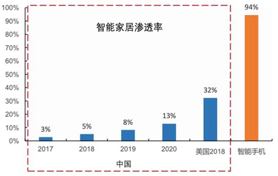 美国作为第一个进入全球智能家居市场的国家,截止到2018年,约有32%的美国家庭都配备了家庭自动化系统,预计今年用户数量将达到53.1%。而中国的智能家居市场的渗透率截止到2020年也仅有13%,智能手机的渗透率达94%,市场空间非常广阔。