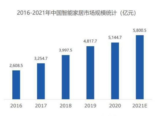 数据显示,2016-2021年我国智能家居市场规模由2608.5亿元增至5800.5亿元,近六年增长了3192亿元,平均每年增长532亿元,体现了人们对品质生活的追求。