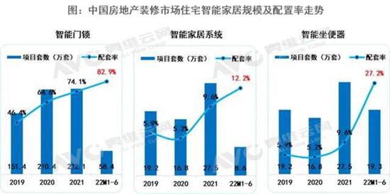 据奥维云网(AVC)监测数据显示,2022年上半年地产精装修市场智能家居配套项目个数774个,配套量82.54万套。
