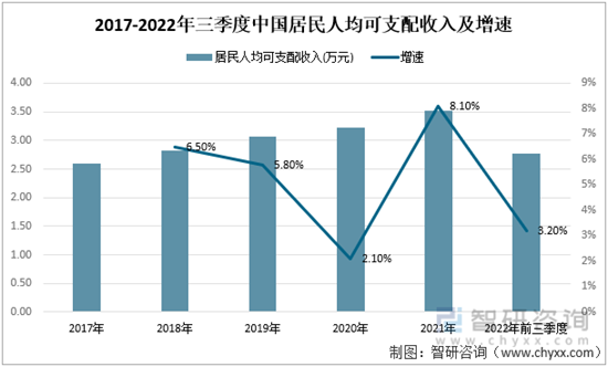 2017-2021年期间,随着经济持续稳定恢复,就业形势稳定带动了工资性收入的增长,加上各地持续加大民生保障力度,使得我国居民人均可支配收入呈现出稳定增长的趋势,2021年中国居民人均可支配收入同比增速为8.1%。据国家统计局最新数据统计,我国2022年前三季度居民人均可支配收入为2.77万元,同比增长了3.2%。居民人均可支配收入的增加,在一定程度上可以拉动消费需求的增长,生活质量的持续提高,会进一步刺激更高层次需求的产生。
