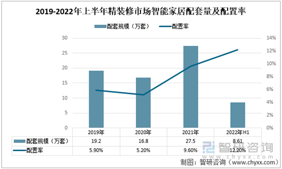 2019-2022年上半年中国房地产精装修市场智能家居配套量及配置率
