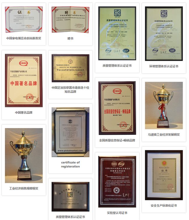 我司现有足浴保健养生机、足浴保健按摩器、多功能汽车按摩垫、推拿按摩养生机、多功能保健按摩棒、足底保健按摩理疗仪等系列五十余个品种的产品。企业已通过ISO9001:2008质量体系与ISO14001:2004环境质量体系认证,产品均已获得CE/GS/EMC/CB/ETL/ROHS等多项国际认证以及国家专利:其中龙富足浴按摩器被中国市场品牌战略管理联合会评为“中国足浴按摩器市场首选知名品牌”;我司又是通过国际13485医疗器械证书的企业之一。龙富品牌又再次被评为2010年《中国著名品牌》和《全国质量信誉保证,畅销品牌》